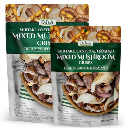 DJ and A Mixed Mushroom Crisps is an accidentally vegan, savoury snack with a combination of shitake, oyster and nameko mushrooms. A ready to eat, all natural snack that is also an excellent source of dietary fibre. Cooked at a lower temperature to preserve the natural mushroom deliciousness, they are just lightly seasoned to enhance the delicious taste!