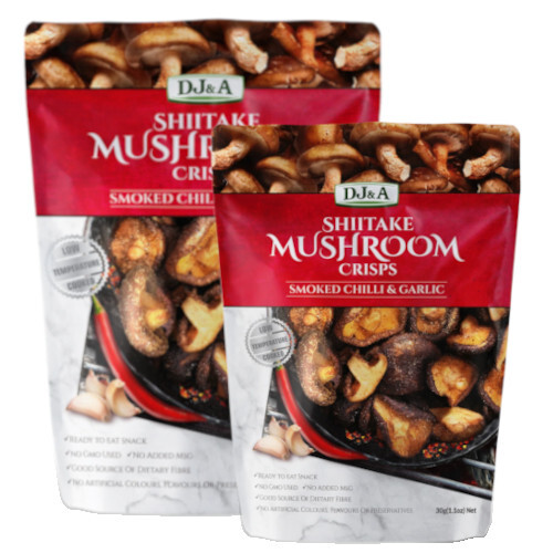 DJ and A Smoked Chilli & Garlic Shiitake Mushroom Crisps is an accidentally vegan, savoury snack that is ready to eat, all natural and an excellent source of dietary fibre. Packed with a smoky chilli flavour and just a hint of garlic.