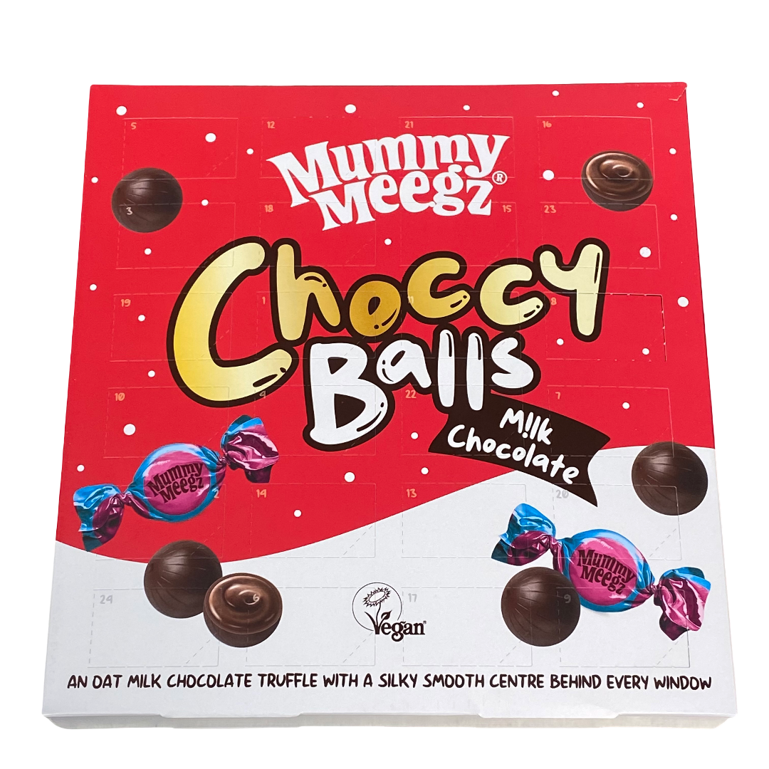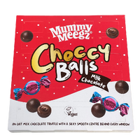 Delectable Mummy Meegz Choccy Balls in a delightful Advent Calendar. 1 Choccy Ball for every luxurious date of December! Plastic and palm oil free. Made with ethical chocolate. The perfect festive countdown!