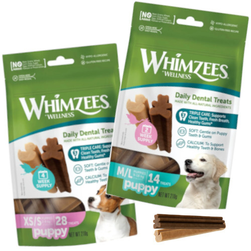 Whimzees Puppy Daily Dental Treats are 100% natural plant based chews, designed to help remove plaque and tartar build-up as your favourite furry friend chews. Softer than the adult WHIMZEES® range, these are specifically designed for puppies and can be used from just 3 months of age.